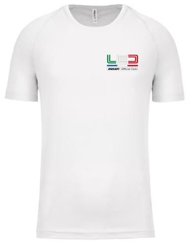 100% polyester. Tissu léger à séchage rapide. Encolure ronde avec bande de propreté. Manches raglan avec points de recouvrement. Finition double aiguille à l'encolure, bas de manches et de vêtement.